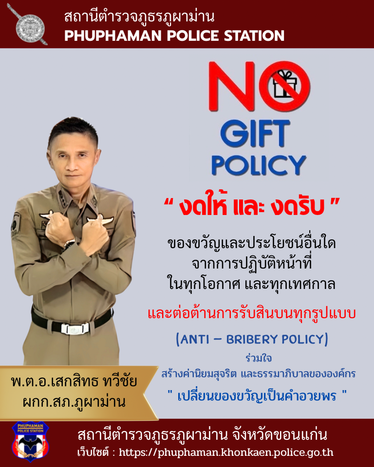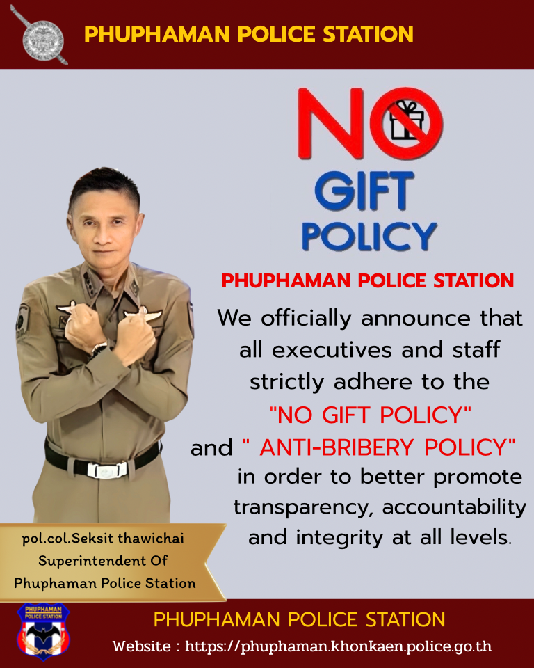 ประกาศสถานีตำรวจภูธรภูผาม่าน เรื่องเจตนารมณ์ที่จะไม่รับของขวัญหรือของกำนัลทุกชนิดจากการปฏิบัติหน้าที่